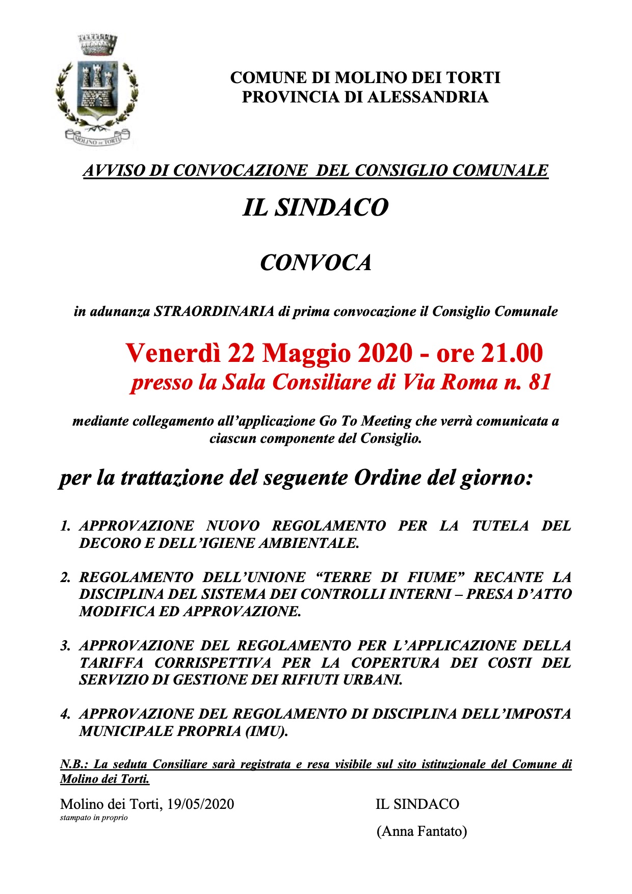 in adunanza STRAORDINARIA di prima convocazione per il giorno Venerdì 22 Maggio 2020 ore 21,00 mediante collegamento all’applicazione Go To Meeting che verrà comunicata a ciascun componente del Consiglio.