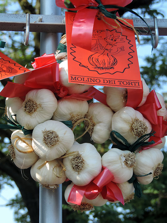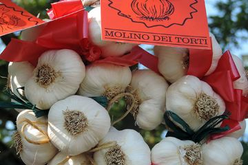 Questa località è rinomata soprattutto per la qualità del suo aglio, considerato tra i migliori in circolazione. Il tutto garantito dai metodi usati dai produttori di Molino i quali non hanno mai abbandonato le tecniche tradizionali e, nel corso degli anni, il loro prodotto si è guadagnato un posto di rilievo sul palcoscenico nazionale. Le tecniche di coltivazione prevedono ancora oggi l’esercizio manuale di buona parte delle operazioni colturali che lo rendono unico sia nelle dimensioni del bulbo che nella colorazione particolarmente bianca della pelle. Le varietà coltivate a Molino sono due: il “Borgognone” o “Ravagno” che si raccoglie verso giugno che è particolarmente adatto nelle insalate, crudo verde, la cui durata e la freschezza del bulbo è limitata mentre l’aglio classico di Molino dei Torti viene raccolto a luglio e dopo un periodo di essiccazione al sole, rivoltato giornalmente per arieggiarlo, viene confezionato in mazzi che possono essere conservati (al fresco) sino all’anno successivo.
